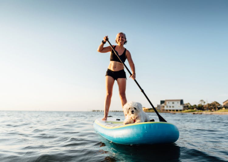 Bichon qui fait du Paddle avec sa maitresse